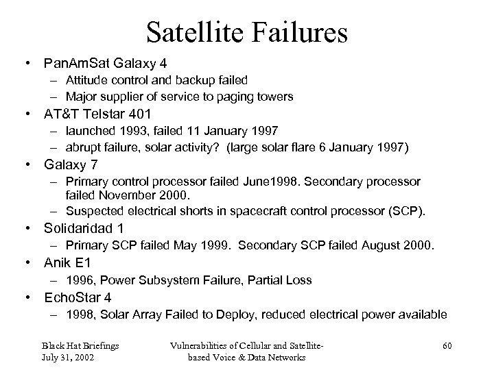 Satellite Failures • Pan. Am. Sat Galaxy 4 – Attitude control and backup failed – Major supplier of service to paging towers • AT&T Telstar 401 – launched 1993, failed 11 January 1997 – abrupt failure, solar activity? (large solar flare 6 January 1997) • Galaxy 7 – Primary control processor failed June 1998. Secondary processor failed November 2000. – Suspected electrical shorts in spacecraft control processor (SCP). • Solidaridad 1 – Primary SCP failed May 1999. Secondary SCP failed August 2000. • Anik E 1 – 1996, Power Subsystem Failure, Partial Loss • Echo. Star 4 – 1998, Solar Array Failed to Deploy, reduced electrical power available Black Hat Briefings July 31, 2002 Vulnerabilities of Cellular and Satellitebased Voice & Data Networks 60