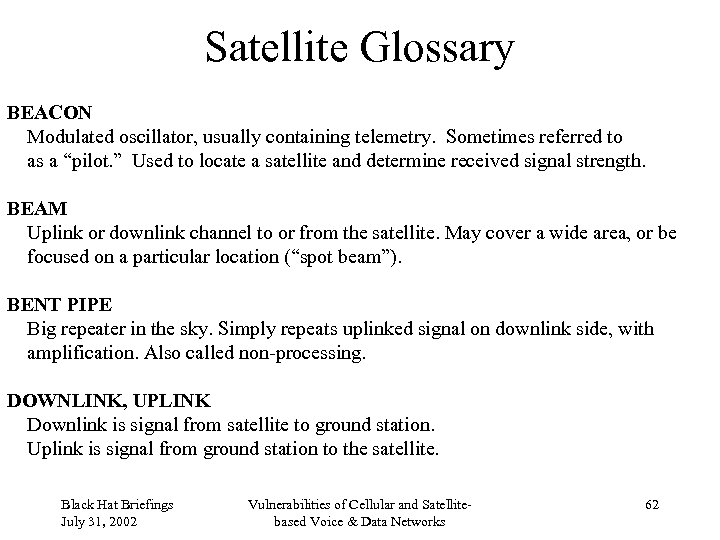 Satellite Glossary BEACON Modulated oscillator, usually containing telemetry. Sometimes referred to as a “pilot. ” Used to locate a satellite and determine received signal strength. BEAM Uplink or downlink channel to or from the satellite. May cover a wide area, or be focused on a particular location (“spot beam”). BENT PIPE Big repeater in the sky. Simply repeats uplinked signal on downlink side, with amplification. Also called non-processing. DOWNLINK, UPLINK Downlink is signal from satellite to ground station. Uplink is signal from ground station to the satellite. Black Hat Briefings July 31, 2002 Vulnerabilities of Cellular and Satellitebased Voice & Data Networks 62