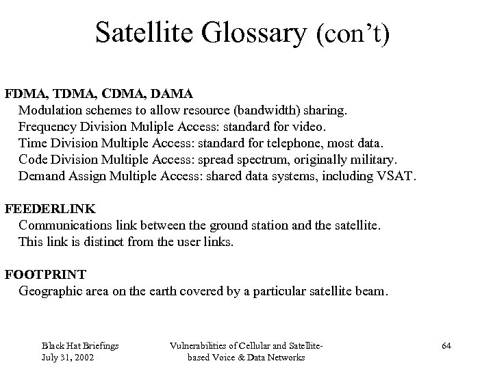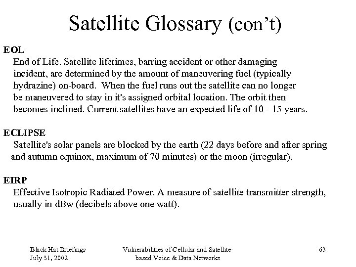 Satellite Glossary (con’t) EOL End of Life. Satellite lifetimes, barring accident or other damaging incident, are determined by the amount of maneuvering fuel (typically hydrazine) on-board. When the fuel runs out the satellite can no longer be maneuvered to stay in it's assigned orbital location. The orbit then becomes inclined. Current satellites have an expected life of 10 - 15 years. ECLIPSE Satellite's solar panels are blocked by the earth (22 days before and after spring and autumn equinox, maximum of 70 minutes) or the moon (irregular). EIRP Effective Isotropic Radiated Power. A measure of satellite transmitter strength, usually in d. Bw (decibels above one watt). Black Hat Briefings July 31, 2002 Vulnerabilities of Cellular and Satellitebased Voice & Data Networks 63