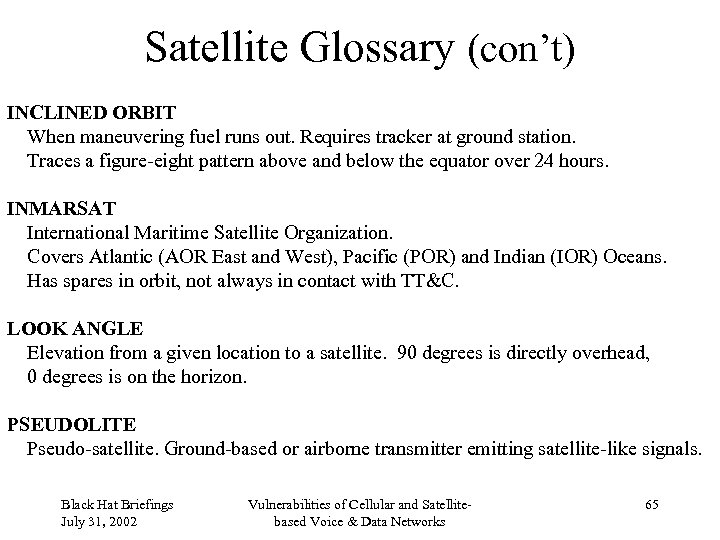 Satellite Glossary (con’t) FDMA, TDMA, CDMA, DAMA Modulation schemes to allow resource (bandwidth) sharing. Frequency Division Muliple Access: standard for video. Time Division Multiple Access: standard for telephone, most data. Code Division Multiple Access: spread spectrum, originally military. Demand Assign Multiple Access: shared data systems, including VSAT. FEEDERLINK Communications link between the ground station and the satellite. This link is distinct from the user links. FOOTPRINT Geographic area on the earth covered by a particular satellite beam. Black Hat Briefings July 31, 2002 Vulnerabilities of Cellular and Satellitebased Voice & Data Networks 64
