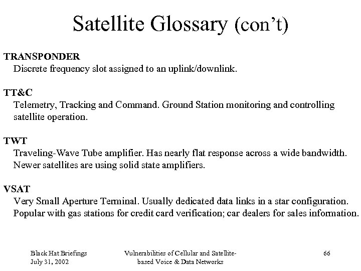 Satellite Glossary (con’t) INCLINED ORBIT When maneuvering fuel runs out. Requires tracker at ground station. Traces a figure-eight pattern above and below the equator over 24 hours. INMARSAT International Maritime Satellite Organization. Covers Atlantic (AOR East and West), Pacific (POR) and Indian (IOR) Oceans. Has spares in orbit, not always in contact with TT&C. LOOK ANGLE Elevation from a given location to a satellite. 90 degrees is directly overhead, 0 degrees is on the horizon. PSEUDOLITE Pseudo-satellite. Ground-based or airborne transmitter emitting satellite-like signals. Black Hat Briefings July 31, 2002 Vulnerabilities of Cellular and Satellitebased Voice & Data Networks 65
