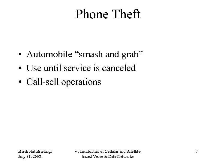 Analog Cellular • Authentication is valid Electronic Serial Number (ESN) and Mobile Identification Number (MIN) pair • Sent from mobile to base in the clear • Early systems had just a “deny” list • Not all systems initially available to each other for roaming verification Black Hat Briefings July 31, 2002 Vulnerabilities of Cellular and Satellitebased Voice & Data Networks 6