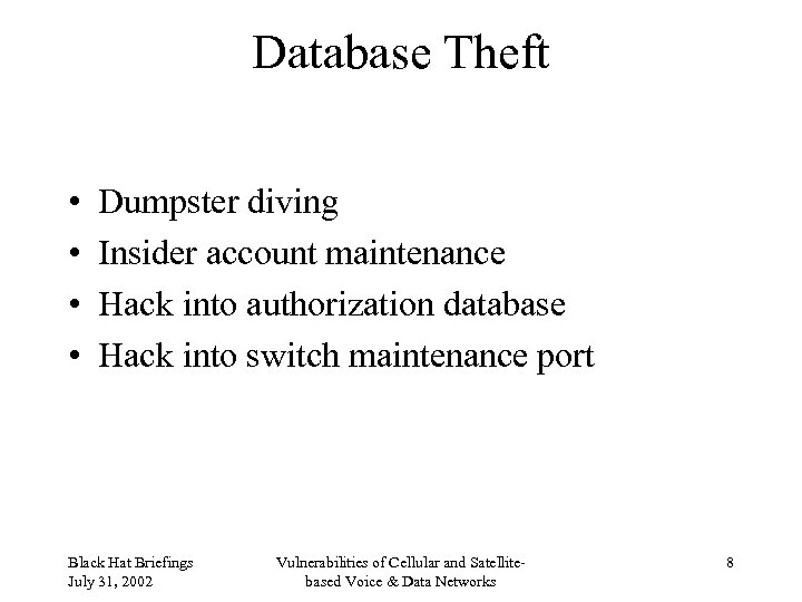Phone Theft • Automobile “smash and grab” • Use until service is canceled • Call-sell operations Black Hat Briefings July 31, 2002 Vulnerabilities of Cellular and Satellitebased Voice & Data Networks 7