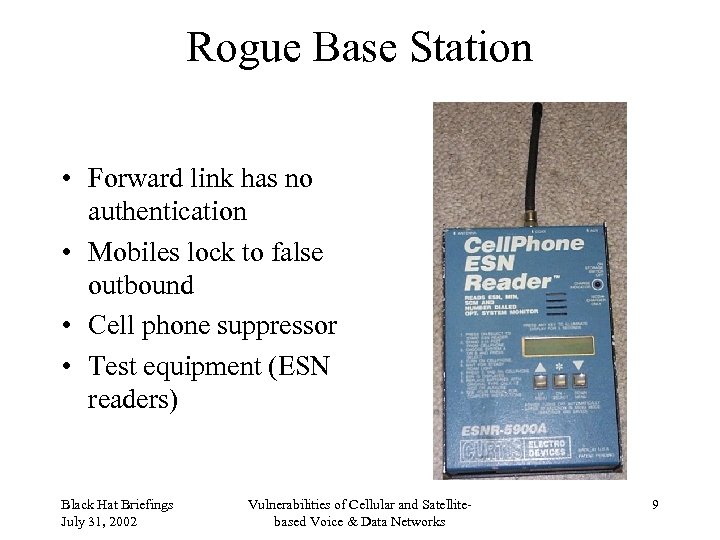 Database Theft • • Dumpster diving Insider account maintenance Hack into authorization database Hack into switch maintenance port Black Hat Briefings July 31, 2002 Vulnerabilities of Cellular and Satellitebased Voice & Data Networks 8