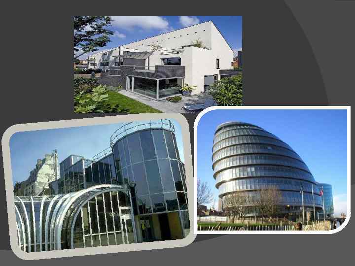 Техно-современность Реализация идей хай-тека продолжается и по сей день, воплощаясь в самых необычных по форме и технологически изощренных архитектурных проектах. В 2004 году в Лондоне завершилось строительство здания, принадлежащего страховой компании «Swiss RE» , уникальный дизайн которого разработан Норманом Фостером. Сооружение является первым небоскребом Лондона, имеющим естественную систему кондиционирования и вентилирования. Геометрия дома напоминает сосновую шишку, способную раскрываться и закрываться в зависимости от изменений погоды. Свежий воздух проходит через спиральные колеса, обеспечивая естественную вентиляцию кабинетов. Двухслойные секционные стекла помещений позволяют воздуху согреваться между слоями и охлаждаться при открывании секций. А специальное покрытие стекол задерживает 86% солнечного света, не допуская чрезмерного повышения температуры внутри помещений.