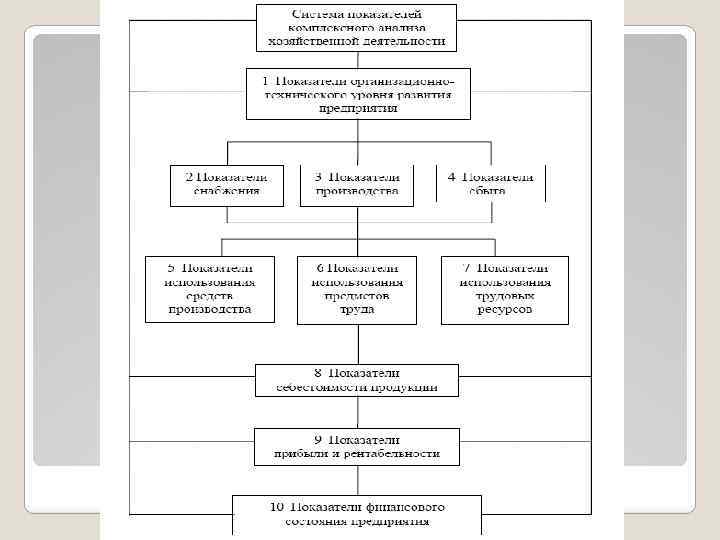 Виды анализа хозяйственной деятельности Классификационный признак Вид анализа 1. Отраслевой 1. 1. Отраслевой 1. 2. Межотраслевой 2. Временной 2. 1. Предварительный (перспективный) 2. 2. Последующий (ретроспективный): 2. 2. 1. Оперативный (ситуационный) 2. 2. 2. Итоговый (заключительный) 3. Пространственный 3. 1. Внутрихозяйственный 3. 2. Межхозяйственный 4. По объектам управления 4. 1. Технико-экономический 4. 2. Финансово-экономический 4. 3. Аудиторский (бухгалтерский) 4. 4. Социально-экономический 4. 5. Экономико –экологический и другие 5. По методам изучения объектов 6. По субъектам (пользователям) 7. По охвату изучаемых объектов 8. По содержанию программ 5. 1. Сравнительный 5. 2. Диагностический (экспресс) 5. 3. Факторный 5. 4. Экономико-математический и другие 6. 1. Внутренний 6. 2. Внешний 7. 1. Сплошной 7. 2. Выборочный 8. 1. Комплексный 8. 2. Тематический
