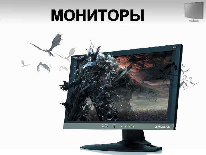Классификация мониторов По строению: • ЭЛТ — на основе электронно-лучевой трубки (англ. cathode ray tube, CRT) • ЖК — жидкокристаллические мониторы (англ. liquid crystal display, LCD) • Плазменный — на основе плазменной панели (PDP и PALC) • Проекционный — видеопроектор и экран, размещённые отдельно или объединённые в одном корпусе (как вариант — через зеркало или систему зеркал) • FED - плоский дисплей на основе эффекта полевой эмиссии электронов и люминофором(англ. Field Emission Display) • SED (Surface-conduction Emission Display) - поверхностно-проводящие электроноизлучающие дисплеи • OLED-монитор — на технологии OLED (англ. organic light-emitting diode — органический светоизлучающий диод) • LED - дисплей построен на светодиодной технологии (LED - Light Emitting Diodes). • Виртуальный ретинальный монитор — технология устройств вывода, формирующая изображение непосредственно на сетчатке глаза. • Стереодисплей, он же 3 D дисплей или трёхмерный дисплей