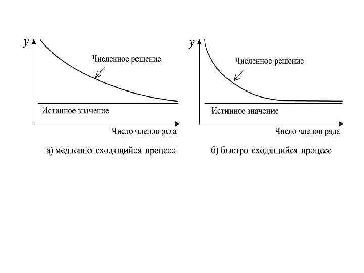 Введем еще одно понятие – сходимость численного метода, которое обозначает приближение (стремление) результата численного метода к истинному решению. Различают сходимость итерационного процесса, когда при решении задачи для нахождения искомых значений многократно повторяют какой-то процесс (выполняют последовательные итерации), получая последовательность решений (значений). Говорят, что эта последовательность сходится к точному решению, если при неограниченном возрастании числа итераций решение все ближе приближается к действительному и в пределе (при устремлении числа итераций к бесконечности) равно ему. К таким задачам относится и задача вычисления при разложении его в ряд. Чем больше членов ряда мы возьмем, тем ближе его значение будет приближаться к действительному; при этом значения последних слагаемых здесь должны все более уменьшаться. Скорость этого уменьшения характеризует скорость процесса схождения итерационного процесса.