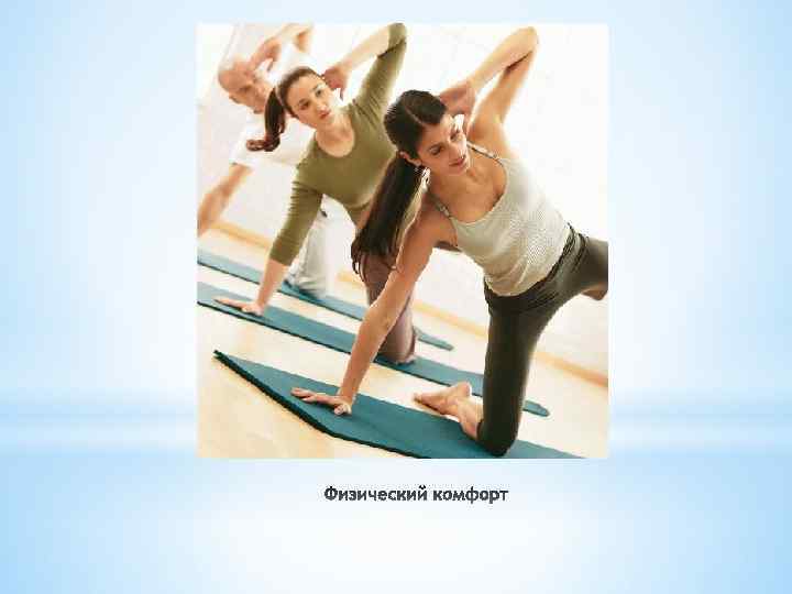 *Физический комфорт- это оптимальное физическое самочувствие, возникающее при определенных сочетаниях температуры, влажности и т. д. *Очень многие заболевания вызваны отсутствием физической активности, благодаря чему, человек испытывает физический дискомфорт. *Физический комфорт настолько запрограммирован в человеческие потребности, что даже когда все наши базовые нужды удовлетворены, мы все еще будем стараться улучшить их.