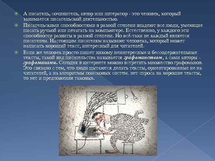 А писатель, сочинитель, автор или литератор - это человек, который занимается писательской деятельностью. Писательскими способностями в разной степени владеют все люди, умеющие писать ручкой или печатать на компьютере. Естественно, у каждого эти способности развиты в разной степени. Но всё-таки не каждый является писателем. Настоящим писателям называют человека, который может написать хороший текст, интересный для читателей. Если же человек просто пишет никому неинтересные и бессодержательные тексты, такой вид писательства называется графоманством, а сами авторы - графоманами. Сегодня в интернете можно встретить множество графоманов. Это связано с тем, что люди пытаются делать тексты, ориентированные не на читателей, а на алгоритмы поисковых систем. нет спроса на хорошие тексты, то нет и предложения таковых.