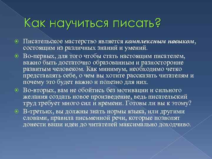 Как научиться писать? Писательское мастерство является комплексным навыком, состоящим из различных знаний и умений. Во-первых, для того чтобы стать настоящим писателем, важно быть достаточно образованным и разносторонне развитым человеком. Как минимум, необходимо четко представлять себе, о чем вы хотите рассказать читателям и почему это будет важно и полезно для них. Во-вторых, вам не обойтись без мотивации и сильного желания создать новое произведение, ведь писательский труд требует много сил и времени. Готовы ли вы к этому? В-третьих, вы должны знать нормы языка, или другими словами, правила письменной речи, которые позволят донести ваши идеи до читателей максимально доходчиво.