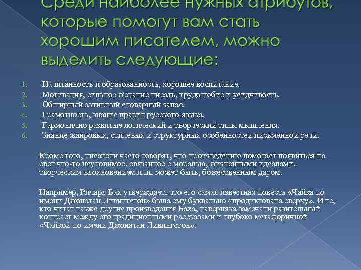 Среди наиболее нужных атрибутов, которые помогут вам стать хорошим писателем, можно выделить следующие: 1. 2. 3. 4. 5. 6. Начитанность и образованность, хорошее воспитание. Мотивация, сильное желание писать, трудолюбие и усидчивость. Обширный активный словарный запас. Грамотность, знание правил русского языка. Гармонично развитые логический и творческий типы мышления. Знание жанровых, стилевых и структурных особенностей письменной речи. Кроме того, писатели часто говорят, что произведению помогает появиться на свет что-то неуловимое, связанное с моралью, жизненными идеалами, творческим вдохновением или, может быть, божественным даром. Например, Ричард Бах утверждает, что его самая известная повесть «Чайка по имени Джонатан Ливингстон» была ему буквально «продиктована сверху» . И те, кто читал также другие произведения Баха, наверняка замечали разительный контраст между его традиционными рассказами и глубоко метафоричной «Чайкой по имени Джонатан Ливингстон» .