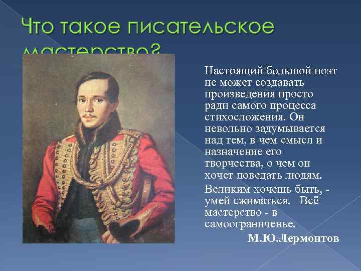 Что такое писательское мастерство? Настоящий большой поэт не может создавать произведения просто ради самого процесса стихосложения. Он невольно задумывается над тем, в чем смысл и назначение его творчества, о чем он хочет поведать людям. Великим хочешь быть, - умей сжиматься. Всё мастерство - в самоограниченье. М. Ю. Лермонтов