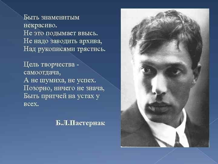 Быть знаменитым некрасиво. Не это подымает ввысь. Не надо заводить архива, Над рукописями трястись. Цель творчества - самоотдача, А не шумиха, не успех. Позорно, ничего не знача, Быть притчей на устах у всех. Б. Л. Пастернак