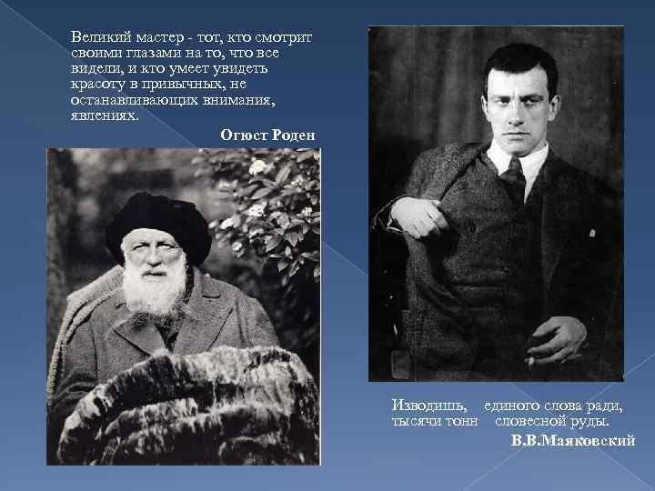 Великий мастер - тот, кто смотрит своими глазами на то, что все видели, и кто умеет увидеть красоту в привычных, не останавливающих внимания, явлениях. Огюст Роден Изводишь, единого слова ради, тысячи тонн словесной руды. В. В. Маяковский