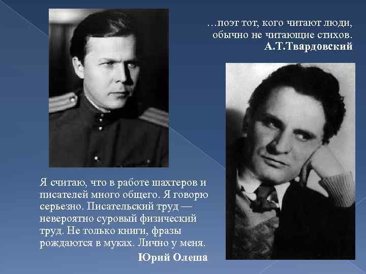 …поэт тот, кого читают люди, обычно не читающие стихов. А. Т. Твардовский Я считаю, что в работе шахтеров и писателей много общего. Я говорю серьезно. Писательский труд — невероятно суровый физический труд. Не только книги, фразы рождаются в муках. Лично у меня. Юрий Олеша