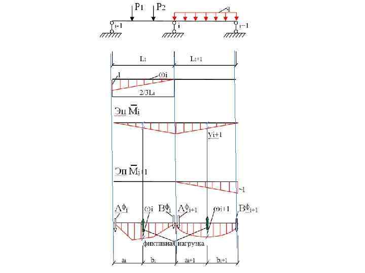 Если площади эпюры Мр в каждом пролете принять за фиктивную нагрузку – ωi, то от фиктивной нагрузки будут фиктивные реакции. ΣМB = -Афi * Li+ωi*Li=0 Представляем фиктивные реакции в уравнение (2) Mi-1 Li + 2 Mi(Li+Li+1)+Mi+1*Li+1= -6(Bфi+ Афi+1) (3) Сумма фиктивных реакций, примыкающих к i - ой опоре.