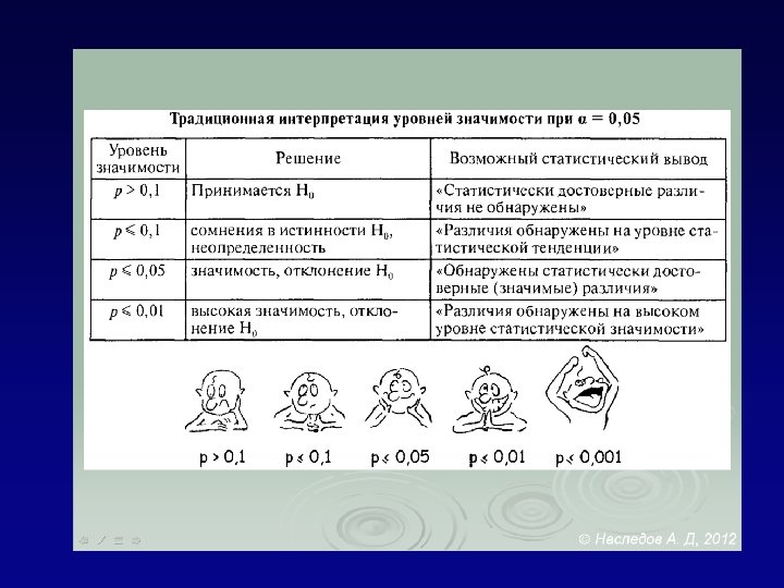 Чем является и чем не является р-value S. Goodmen. A Dirty Dozen: Twelve P-value Misconceptions (2008) q р-value P(H 0), т. е. это не есть вероятность нулевой гипотезы об отсутствии различий q Малость р-value не гарантирует высокую вероятность получить аналогичные результаты в повторном эксперименте
