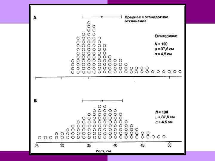 Если распределение асимметрично полагаться на среднее и стандартное отклонение нельзя. А. Распределение юпитериан по росту. Б. Нормальное распределение с теми же средним и стандартным отклонением, не смотря на тождественность параметров, оно ничуть не похоже на реальное распределение юпитериан.