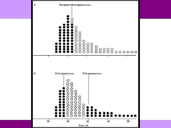 Для описания асимметричного распределения следует использовать медиану и процентили. Медиана — это значение, которое делит распределение пополам. А. Медиана роста юпитериан — 36 см. Б. 25 -й и 75 -й процентили отсекают четверть самых низких и четверть самых высоких юпитериан 25 -й процентиль ближе к медиане, чем 75 -й — это говорит об асимметричности распределения.