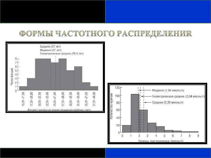 Логнормальное распределение - Распределение вероятности случайной переменной, логарифм которого (по основанию 10 или более е – основание натурального логарифма) имеет нормальное распределение. - Сильно скошено вправо. - Если взять логарифмы исходных данных, которые скошены вправо, мы создадим эмпирическое распределение, которое почти нормальное и тогда данные соответствуют приближенно логнормальному распределению. - Многие переменные в медицине имеют логнормальное распределение. Можно использовать свойства нормального распределения для того, чтобы сделать выводы относительно этих переменных после логарифмического преобразования данных. - Если набор данных имеет логнормальное распределение, то используют среднее геометрическое как обобщающий показатель положения.