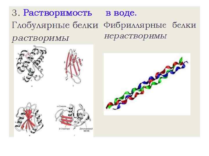 Фибриллярные и глобулярные белки • Фибриллярные белки - белки, образованные полипептидными цепями, которые расположены параллельно другу вдоль одной оси и образуют длинные волокна (фибриллы) или слои. Коллаге н — фибриллярный белок, составляющий основу соединительной ткани организма (сухожилие, кость, хрящ, дермаи т. п. ) и обеспечивающий её прочность и эластичность. Молекула коллагена представляет собой правозакрученную спираль из трёх α-цепей. Волосы, ногти состоят главным образом из ɑ-кератина.