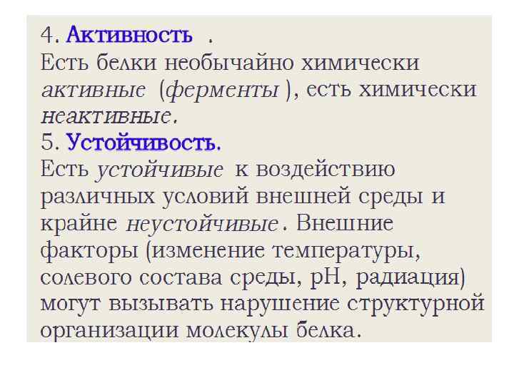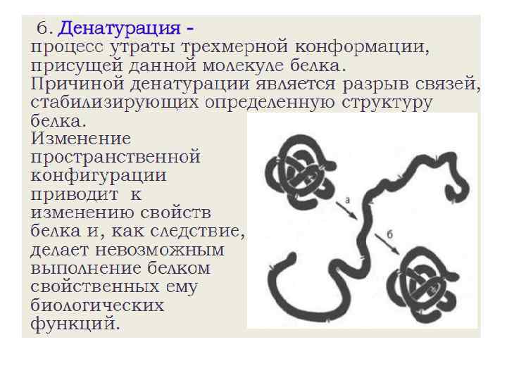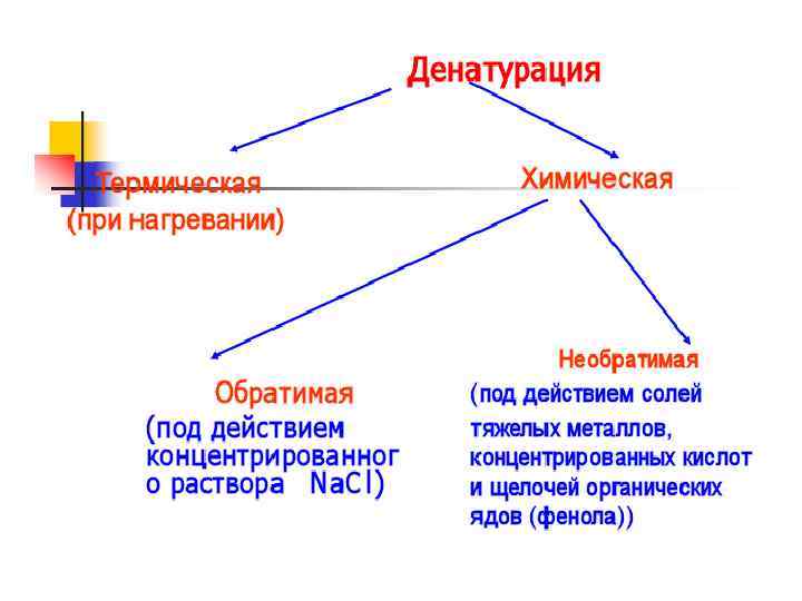 Денатурирующие агенты Особенности действия реагента Высокая температура (свыше 60°С) Разрушение слабых связей в белке Кислоты и щелочи Изменение ионизации ионогенных групп, разрыв ионных и водородных связей Мочевина Разрушение внутремолекулярных водородных связей в результате образования водородных связей с мочевиной Спирт, фенол, хлорамин Разрушение гидрофобных, водородных связей Соли тяжелых металлов Образование нерастворимых солей белков с ионами тяжелых металлов