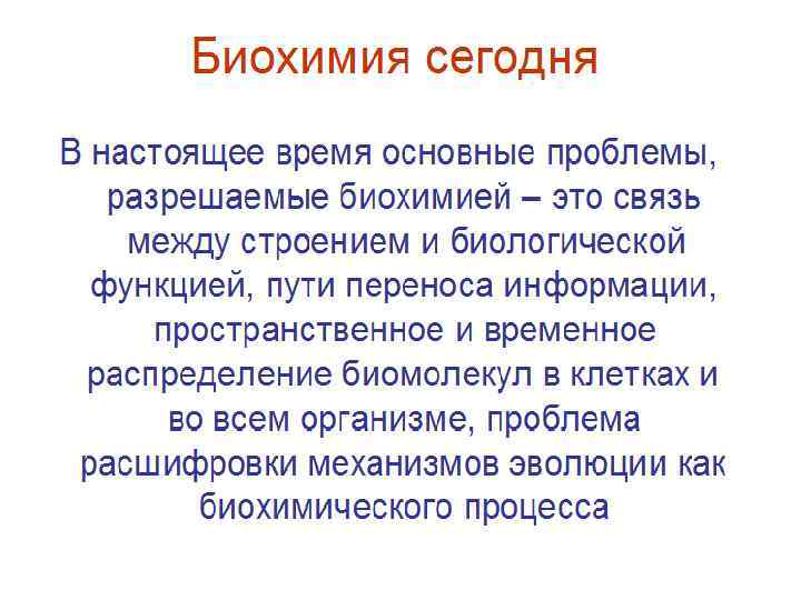 Задачи биохимии • • Изучение строения и функций биомолекул, входящих в состав тканей организма. Изучение механизмов поступления пластических и биологически активных веществ во внутреннюю среду организма. Изучение механизмов превращения поступивших мономеров в биополимеры, специфичные для данного организма. Изучение механизмов высвобождения, накопления и использования энергии в клетке. Изучение механизмов образования и выведения конечных продуктов распада веществ в организме. Изучение механизмов воспроизведения и передачи наследственных признаков организма. Изучение механизмов регуляции биохимических процессов в организме.