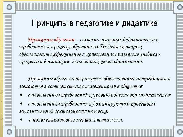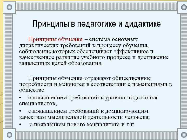 Закономерности обучения выражают существенные и необходимые связи между его условиями и результатом и обозначается термином подход. Подход это совокупность принципов, определяющих стратегию обучения или воспитания. системный, целостный, личностный, деятельностный, полисубъектный, культурологический, этнопедагогический, антропологический.