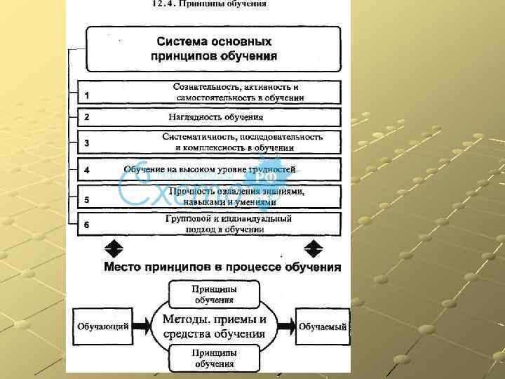 организационно-методические принципы обучения преемственности, последовательности и систематичности; единства группового и индивидуального обучения; соответствия обучения возрастным и индивидуальным особенностям обучаемых; сознательности и творческой активности; доступности при достаточном уровне трудности; наглядности; продуктивности и надежности.