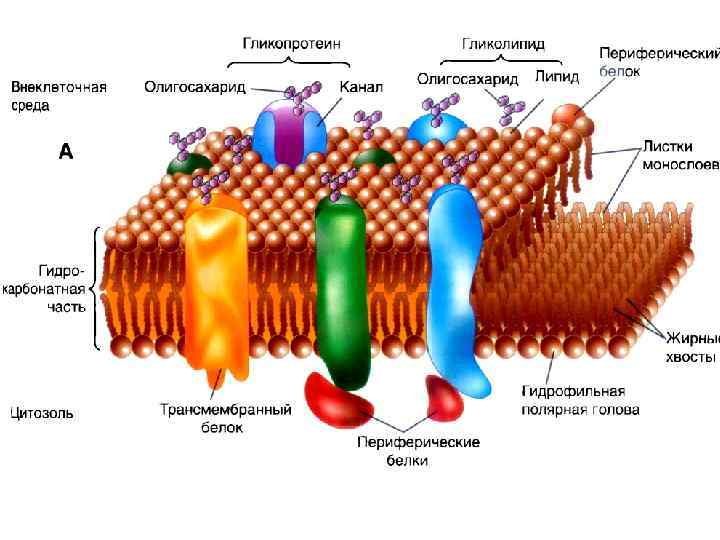 2. Структура и функции клеточной мембраны Биологические мембраны • бислой липопротеидов • углеводы • гликолипиды • гликопротеиды • белки – периферические белки (ферменты, цитоскелет, гликокаликс) – интегральные/трансмембранные - погружены в липиды (каналы, насосы, рецепторы)