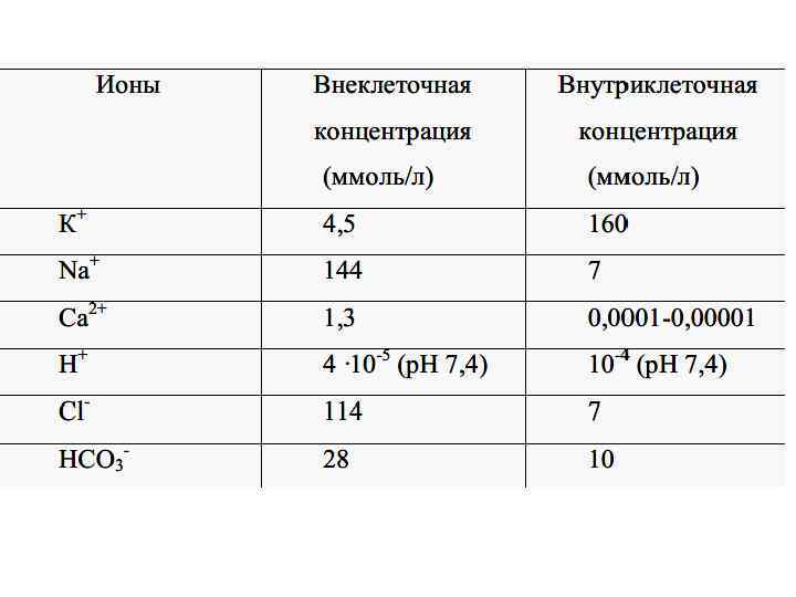 Основы мембранного потенциала покоя 1. Различия концентраций ионов снаружи и внутри клетки [K+in] > [K+out], [Na+in] < [Na+out] 2. Разная проницаемость мембраны (P) для ионов калия, натрия (Pk > PNa в покое) 3. Наличие белков-насосов (перенос ионов против градиента концентрации)