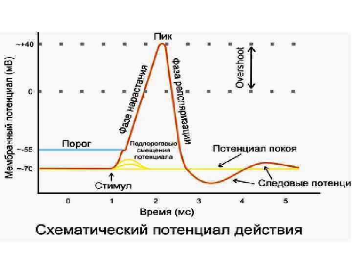 спайк Овершут полная деполяризация реполяризация следовая деполяризация Порог мембранный потенциал покоя следовая гиперполяризация