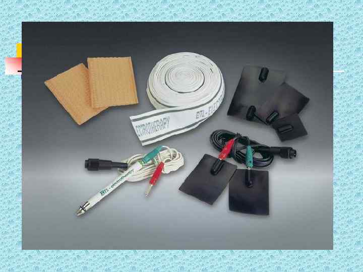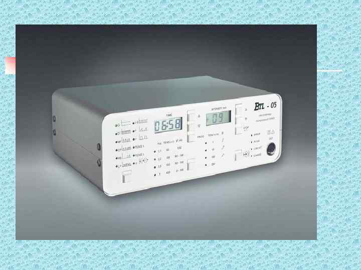 Эффекты в тканях в зависимости от частоты тока n n n 1 -10 Гц - возбуждение симпатических 1 -10 Гц нервов 21 -100 Гц - возбуждение 21 -100 Гц парасимпатических нервов 30 Гц - стимуляция гладких мышц 30 Гц 80 -150 Гц - стимуляция поперечно 80 -150 Гц полосатых мышц, угнетение боли 100 Гц - блокирует проведение импульсов 100 Гц в симпатических терминалях