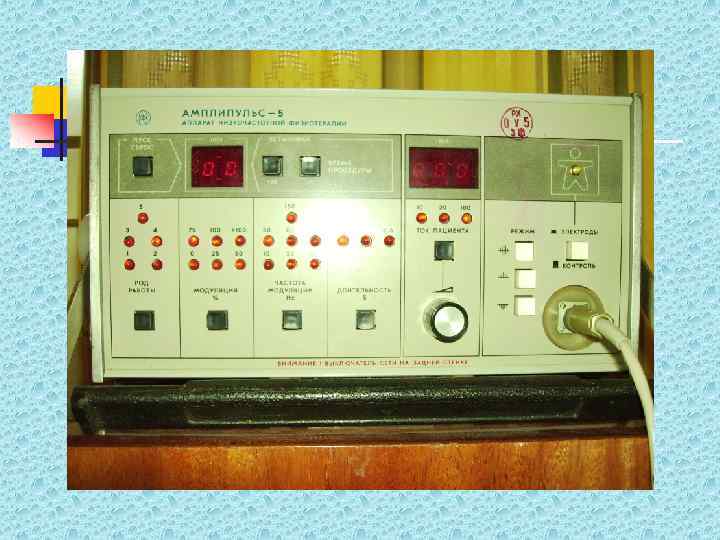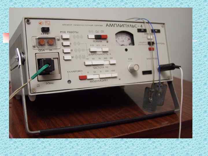 Амплипульстерапия n n n Применение с лечебной целью синусоидального переменного модулированного тока малой силы в импульсном режиме Частота - 5000 Гц Модулируется током низкой частоты в пределах от 10 до 150 Гц