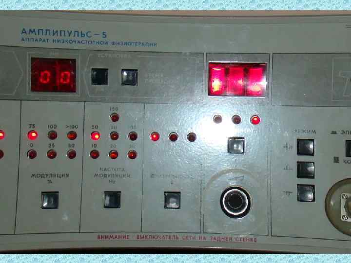 Амплипульстерапия n n уменьшением частоты модуляции до 10 Гц увеличением продолжительности пауз до 6 с увеличением глубины модуляции до 100 % применением выпрямленного режима работы