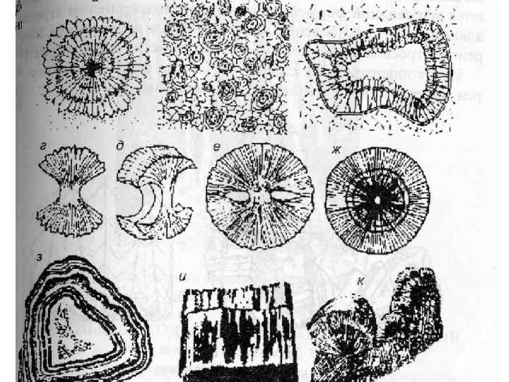 Типы минеральных агрегатов • Незакономерные беспорядочные– однородные, гигантопятнистые, крупнопятнистые, мелкопятнистые. • Закономерные – параллельные, слоистые, радиально-лучистые (конкреции), сноповидные, двойники, тройники, четверники, шестерники, концентрическислоистые (секреции). • Полузакономерные – друза (почти параллельное срастание), щетка, жеода (нарастание кристаллов в полости), сталактиты, сталагмиты.