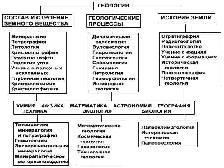 Дифференциация геологии Современная геология – это комплекс наук, развивавшихся из отдельных разделов геологии в процессе дифференциации геологических знаний. Выделяются комплексы геологических наук, характеризующих три направления исследований. Одно направление изучает состав и строение земного вещества, второе – геологические процессы, третье – историю Земли. •