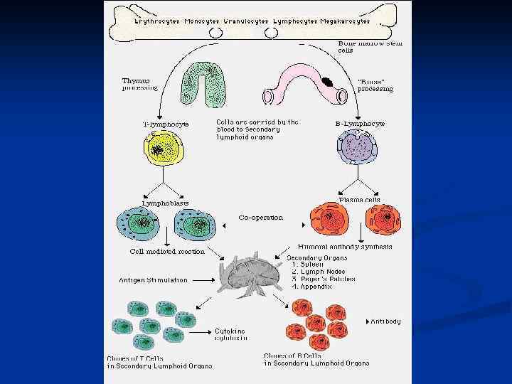 Клетки иммунной системы n Т- лимфоциты (формируются в тимусе) отвечают за клеточный иммунный ответ и имеют рецептор для антигена TCR n В - лимфоциты реализуют гуморальный иммунный ответ с синтезом антител (АТ синтезируются ПК, производными Влимфоцитов) и рецептор для антигена ВСR