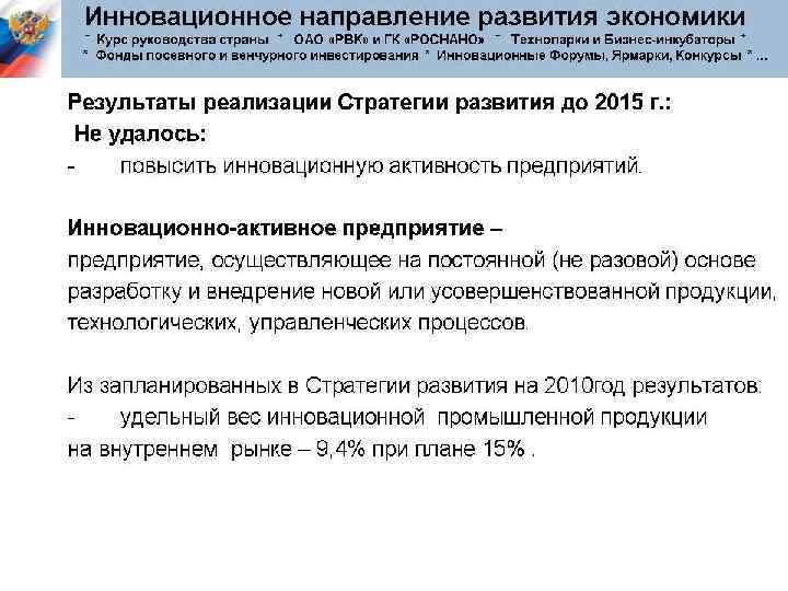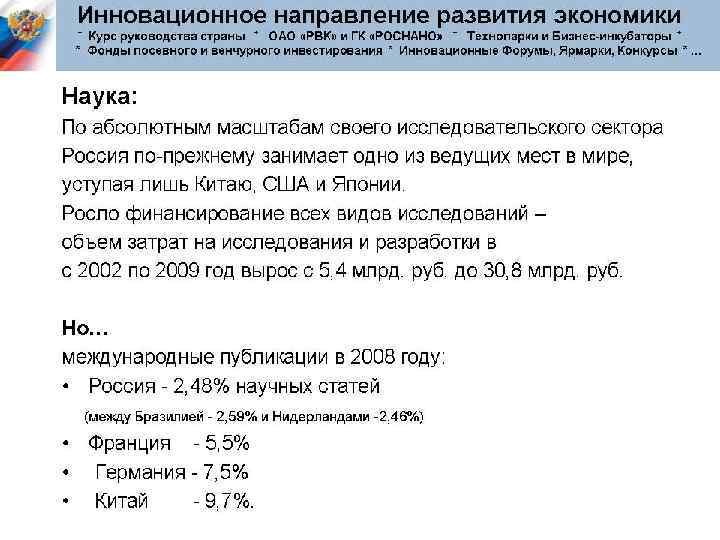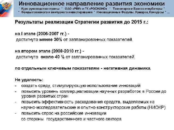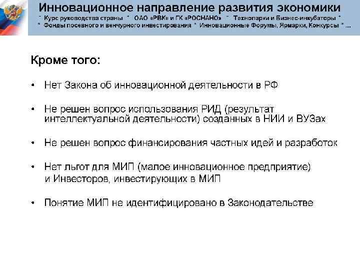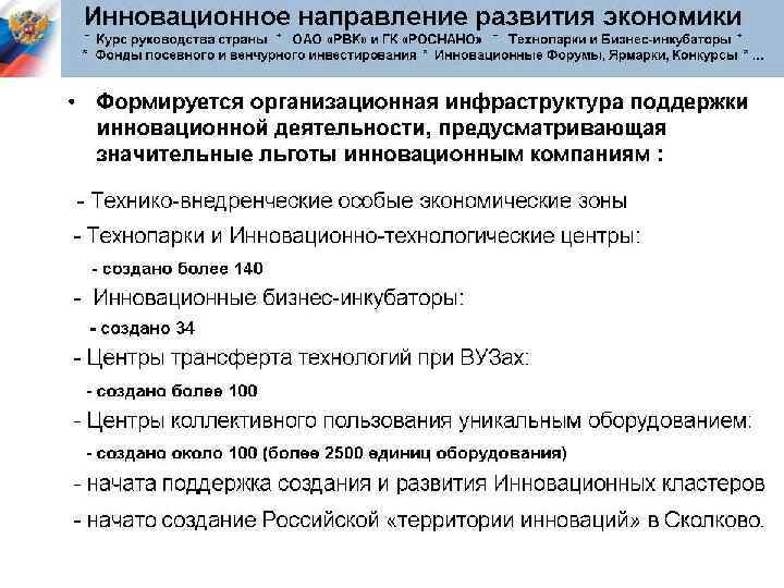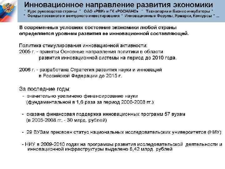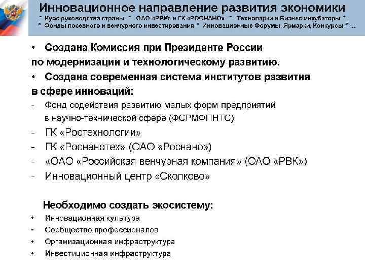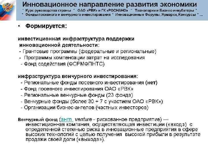 Разрабатывая новые технологии и продукты, апробируя их экономическую эффективность, рисковое предпринимательство позволяет находить новые направления и воздействовать на научно-технический прогресс. Крупные фирмы получают возможность усиленно перспективные направления и не поддерживать тупиковые. поддерживать Рисковые предприятия также стимулируют конкуренцию, подталкивая крупные фирмы к инновационной активности.