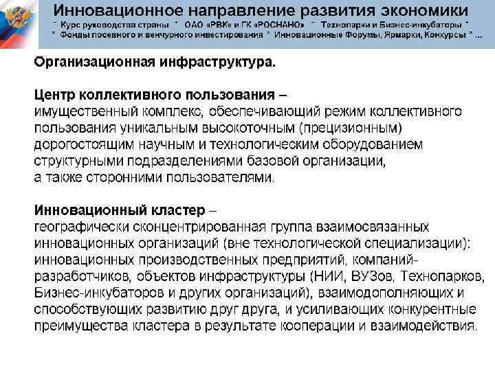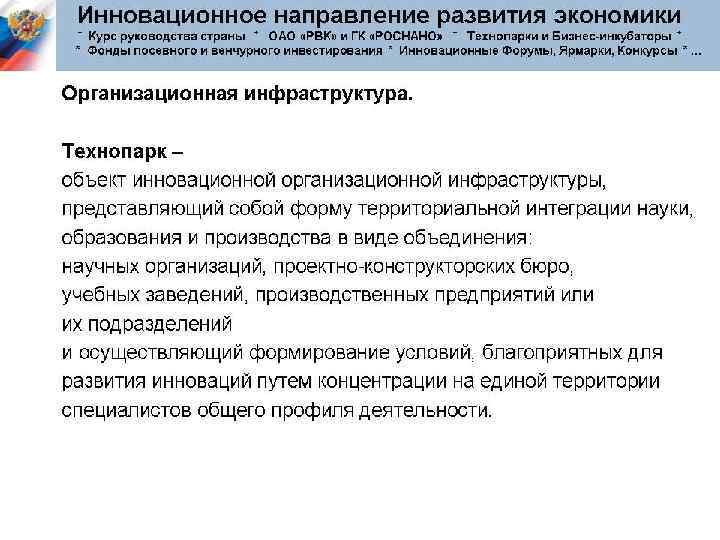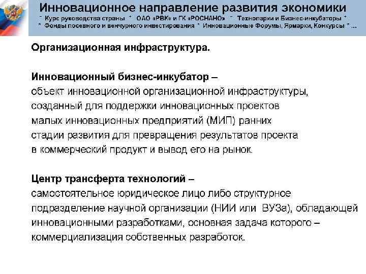 Инфраструктура инновационной деятельности: Генераторы идей; Научные и проектные организации; Инвестиционные институты; Промышленные предприятия; Торгующие организации; Маркетинговые организации; Бизнес-инкубаторы и технопарки