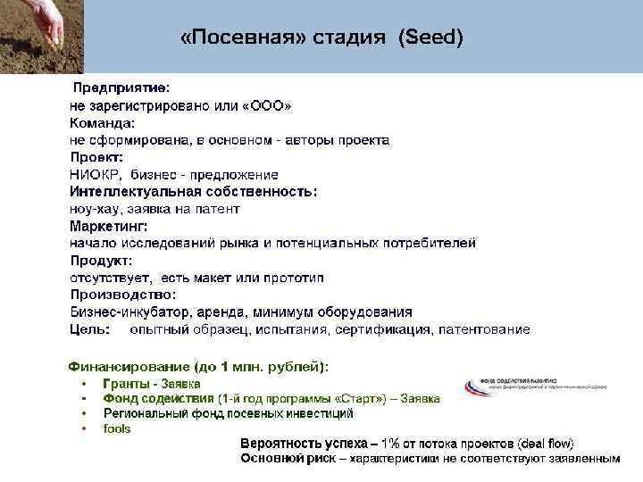 ОКР – следующий этап инновационного процесса. Он имеет цель создание конкретных продуктов, процессов и т. п. и выполняется в лабораториях, КБ, опытных производствах предприятий, кафедрами Вузов. Основной источник финансирования - частные и государственные инвестиции. Особенность финансирования работ на этом этапе - высокая вероятность получения отрицательного результата, и как следствие - наличие экономического риска. Инвестиции этого периода называются рискоинвестициями. Фаза заканчивается передачей в производство технической документации. На следующих этапах осуществляется масштабное освоение производства новшества и его дальнейшая коммерциализация.