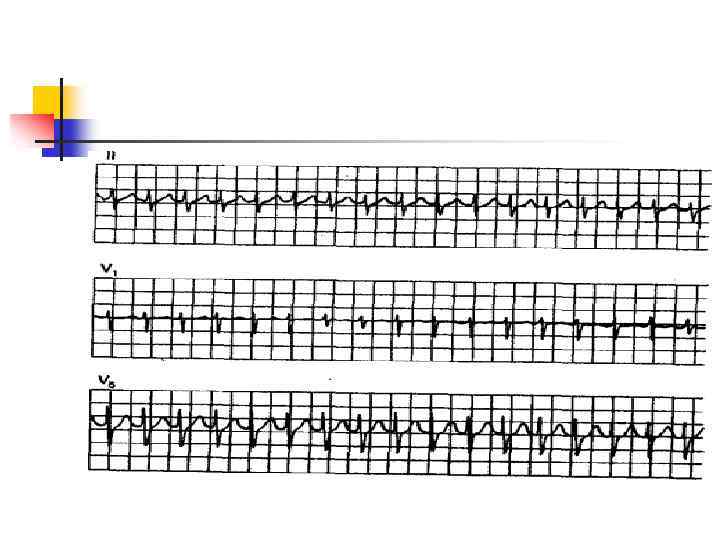 ЗАМЕЩАЮЩИЕ (ВЫСКАЛЬЗЫВАЮЩИЕ) ИДИОВЕНТРИКУЛЯРНЫЕ СОКРАЩЕНИЯ. II КРИТЕРИИ: • Напоминают желудочковые ЭС, однако интервал до замещающего сокращения (интервал сцепления) не укорочен, а удлинен (соответствует ЧСС 20 -50 в 1 мин. ) • В замещающем комплексе зубец Р отсутствует либо ретроградный. ЗАМЕЩАЮЩИЙ ИМПУЛЬС ИСХОДИТ ИЗ ЖЕЛУДОЧКОВ. ЗАМЕЩАЮЩИЕ ИДИОВЕНТРИКУЛЯРНЫЕ СОКРАЩЕНИЯ ОБЫЧНО НАБЛЮДАЮТСЯ ПРИ ЗАМЕДЛЕНИИ СИНУСОВОГО И AV-УЗЛОВОГО РИТМА.