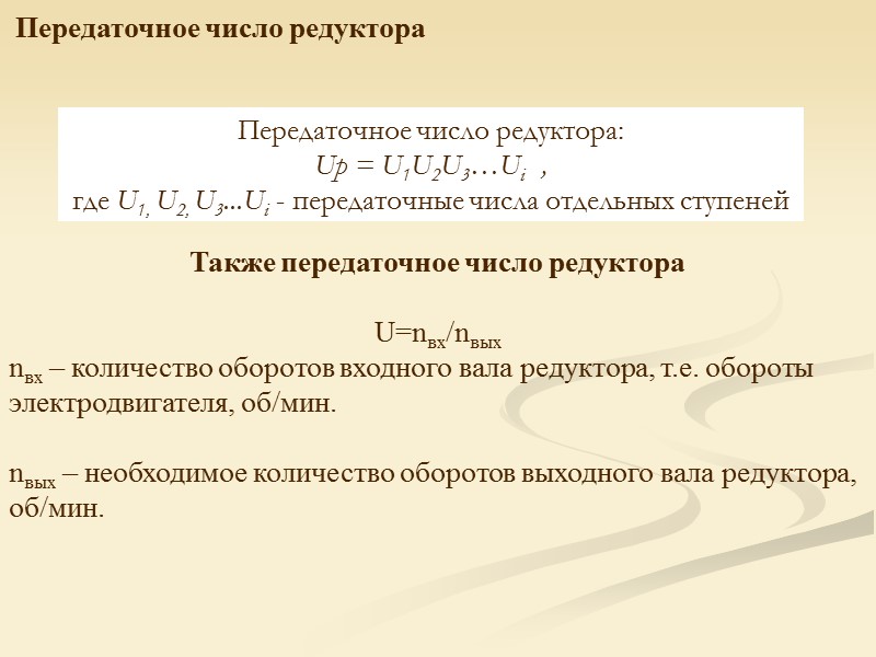 Передаточное число редуктора Передаточное число редуктора: Up = U1U2U3…Ui , где U1, U2, U3...Ui - передаточные числа отдельных ступеней Также передаточное число редуктора U=nвх/nвых nвх – количество оборотов входного вала редуктора, т.е. обороты электродвигателя, об/мин. nвых – необходимое количество оборотов выходного вала редуктора, об/мин.