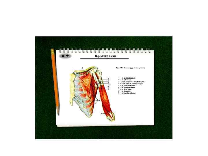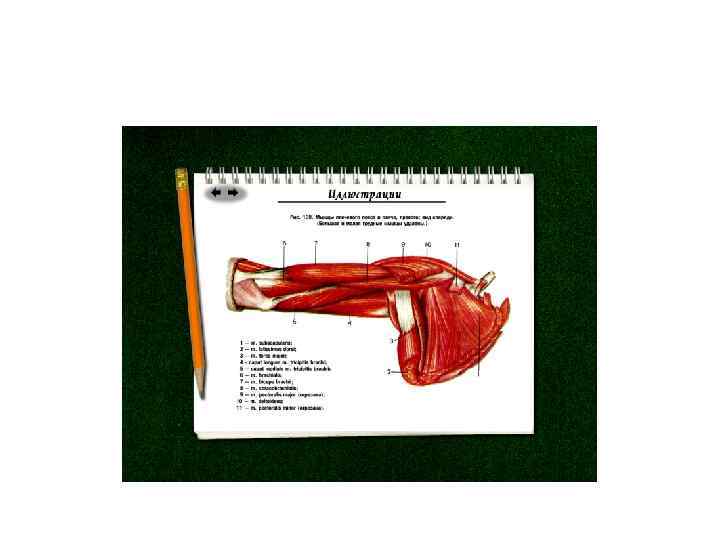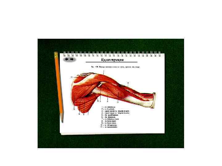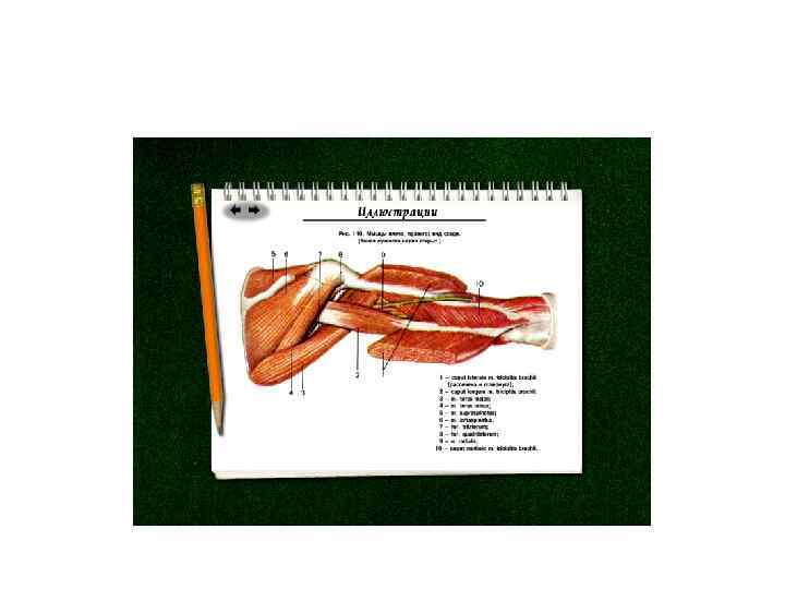 Строение мышцы Начало (origo) Прикрепление (Insertio) Venter – мясистая часть мышцы Tendo – сухожилие Головка – проксимальное сухожилие Хвост – дистальное сухожилие