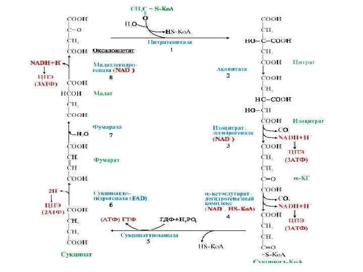 • НАДН, Н+ уходит в цепь переноса электронов • Ацетил-Ко. А, образовавшийся в реакции, катализируемой ПДК, далее вступает в цитратный цикл (цикл Кребса, цикл трикарбоновых кислот) • Этот метаболический путь состоит из реакций, в результате которых углерод ацетильной группы окисляется до двух молекул CO 2, а атомы водорода освобождаются в реакциях дегидрирования при участии NAD+ - и FADзависимых дегидрогеназ.