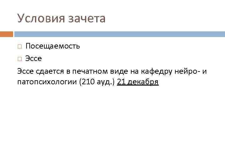 Условия зачета Посещаемость Эссе сдается в печатном виде на кафедру нейро- и патопсихологии (210 ауд. ) 21 декабря