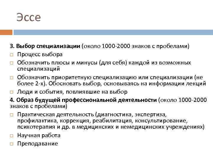 Эссе 3. Выбор специализации (около 1000 -2000 знаков с пробелами) Процесс выбора Обозначить плюсы и минусы (для себя) каждой из возможных специализаций Обозначить приоритетную специализацию или специализации (не более 2 -х). Обосновать выбор, основываясь на информации лекций Люди и события, повлиявшие на выбор 4. Образ будущей профессиональной деятельности (около 1000 -2000 знаков с пробелами) Практическая деятельность (диагностика, экспертиза, профилактика, коррекция, реабилитация, консультирование, психотерапия и др. в медицинских и немедицинских учреждениях) Научная работа Преподавание