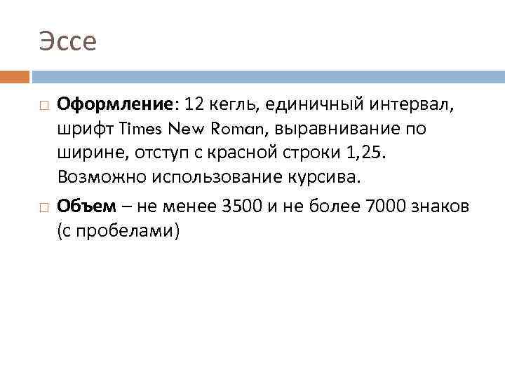 Эссе Оформление: 12 кегль, единичный интервал, шрифт Times New Roman, выравнивание по ширине, отступ с красной строки 1, 25. Возможно использование курсива. Объем – не менее 3500 и не более 7000 знаков (с пробелами)
