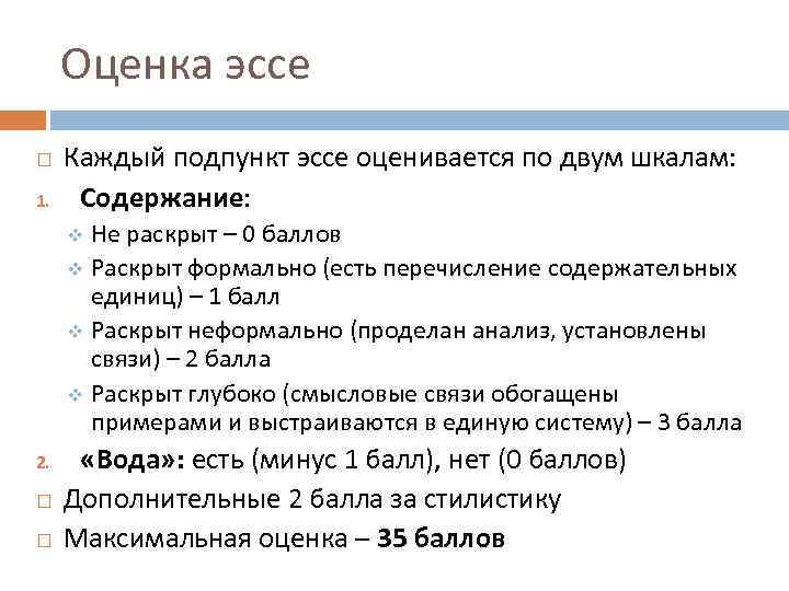 Оценка эссе 1. Каждый подпункт эссе оценивается по двум шкалам: Содержание: Не раскрыт – 0 баллов v Раскрыт формально (есть перечисление содержательных единиц) – 1 балл v Раскрыт неформально (проделан анализ, установлены связи) – 2 балла v Раскрыт глубоко (смысловые связи обогащены примерами и выстраиваются в единую систему) – 3 балла v 2. «Вода» : есть (минус 1 балл), нет (0 баллов) Дополнительные 2 балла за стилистику Максимальная оценка – 35 баллов